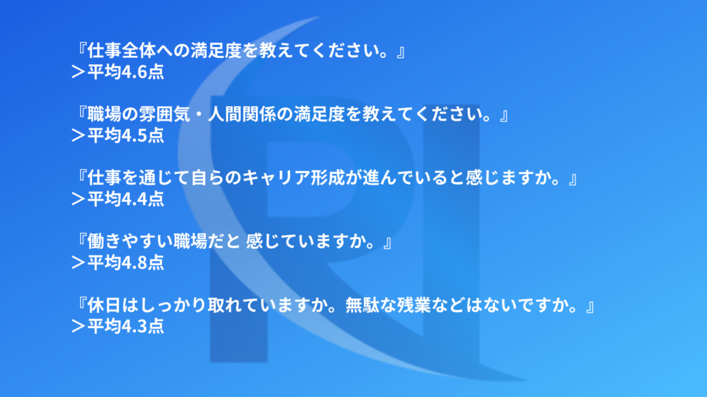 一方で、「休日の取得や残業の有無」については4.7点から4.3点へと評価が低下しました。業務量の変化や一時的な負荷の偏りなどが影響している可能性もあり、今後は業務配分の見直し・採用強化まで含め無理のない体制づくりに取り組んでまいります。